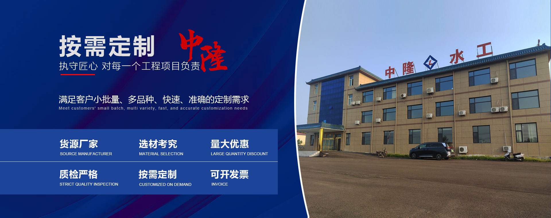 邢臺市中隆水工設備有限公司位于新河縣九龍工業(yè)園區(qū)占地面積20000平方米。北鄰北環(huán)路、西鄰西環(huán)路,交通便利。 公司堅持,依法經(jīng)營,誠信服務的宗旨,尋求合作共創(chuàng)輝煌。融科研制造銷售安裝,服務為一體的水工設備專業(yè)制造公司。優(yōu)質制造設備,規(guī)格齊全,產(chǎn)品檢測體系完整,各項技術指標均達到行業(yè)標準,給客戶提供無憂合作! 主要產(chǎn)品有: &n···